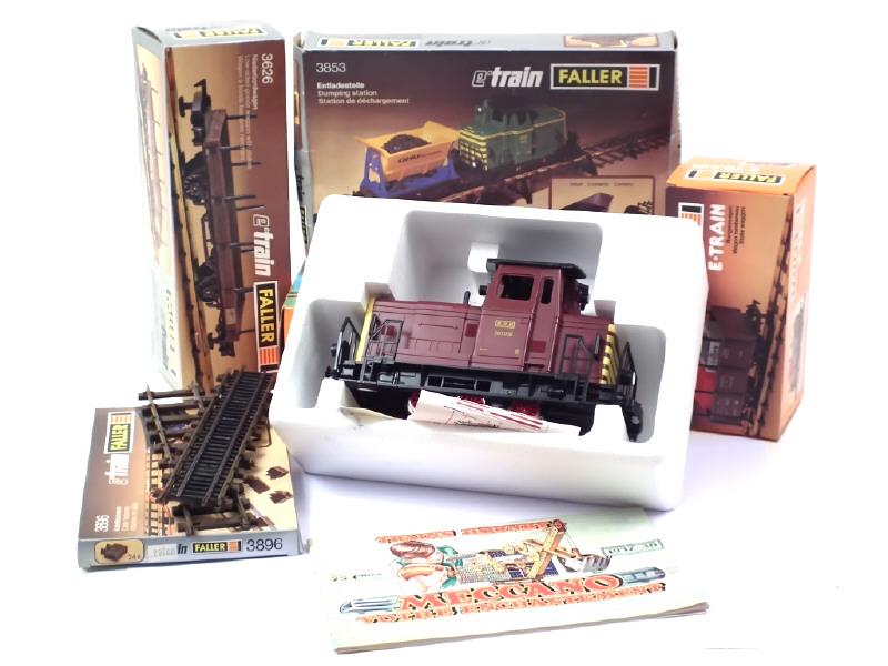 FALLER 'O' (ALLEMAGNE) Ensemble d'une motrice, 2 wagons, une station de déchargement & une boîte d'attaches de cable