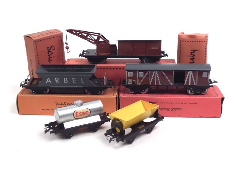 comprend : wagon-citerne 'ESSO' (cirterne légèrement tachée), wagon-trémie 'ARBEL' (boîte en état 'c'), wagon de secours avec grue (petites taches sur le toit), wagon-couvert & wagon-benne basculante (en état 'B.c')