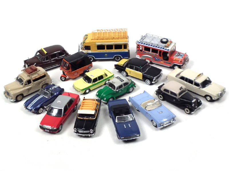 modèles vendus en kiosque - miniatures reproduisant notamment les modèles : JEEPNEY, RENAULT, SEAT, MERCEDES, BAJAJ, TOYOTA & AUSTIN - annotations & détails de peinture ajoutés sur quelques planchers - avec manques