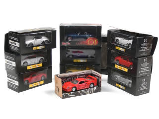 série 'COLLECTION SHELL' - miniatures reproduisant les modèles : BMW (de la marque MAISTO), FERRARI, JAGUAR, ASTON MARTIN, CHRYSLER & PORSCHE - 9 voitures avec moteur à rétrofriction