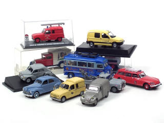 différentes échelles - miniatures reproduisant les modèles : CITROEN, PEUGEOT & RENAULT - on y retrouve notamment les marques : SOLIDO, UNIVERSAL HOBBIES, NOREV, ALTAYA & ELIGOR - 6 modèles avec boîte - petits manques
