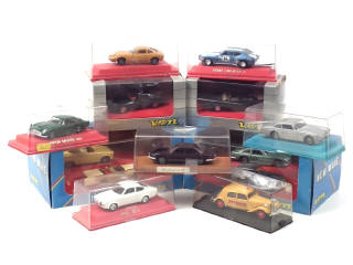 miniatures reproduisant les modèles : ASTON MARTIN (2 exemplaires), ALFA ROMEO (2 exemplaires), BMW (3 exemplaires dont une en kit à monter sous blister jamais ouvert), CITROEN, FERRARI, FORD, MERCEDES, PEUGEOT (2 exemplaires), PANHARD, PORSCHE (3 exemplaires), OPEL & RENAULT (2 exemplaires) - 4 modèles regroupés dans 2 coffrets