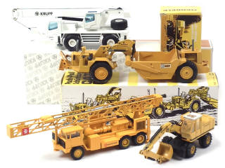 comprend : KRUPP 35 GMT-AT grue télescopique 4x4 (petites traces de polystyrène sur certains pneus, un élément non d'origine), INGERSOLL-RAND 4W foreuse sur porteur 6x4, MENGELE pelle rétro sur pneus & CATERPILLAR 627 motor scaper (état 'C', première version, avec cales & accessoire)