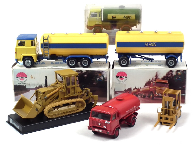comprend : SCANIA LBS 140 avec remorque (avec importantes traces de colle), FIAT citernes 'AGIP' & pompiers, FIAT OM chariot élévateur & FIAT- ALLIS FL20 chargeuse sur chenilles avec ripper - quelques petits manques - on y retrouve les marques : OLD CARS & NACORAL