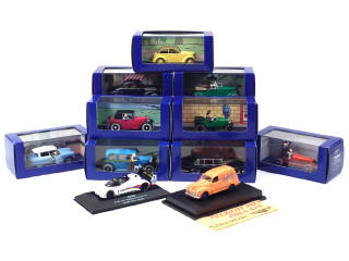 collection 'EN VOITURE TINTIN' - comprend les références : 008, 014, 011, 002, 017, 018, 019, 013 & 004 - sous boîtes-vitrines - on y joint une PEUGEOT 905 'Le Mans 1992' (avec boîte en état 'c' de la marque VITESSE) & une PEUGEOT 203 commerciale 'POULAIN' (série limitée à 100 exemplaires de la marque BBY)