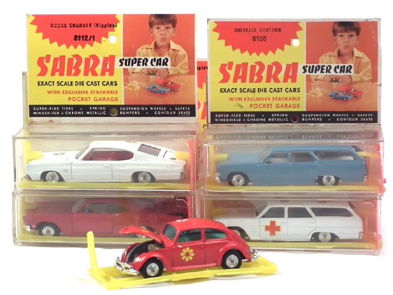 série 'SABRA' - comprend : DODGE CHARGER, CHEVROLET CHEVELLE break (2 exemplaires différents), IMPALA & VOLKSWAGEN COCCINELLE - 2 boîtes en état 'b'