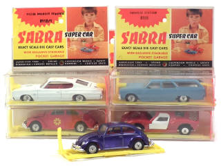 série 'SABRA' - comprend : VOLKSWAGEN COCCINELLE (2 exemplaires différents dont un en état 'B'), DODGE CHARGER, CHEVROLET CHEVELLE break & FORD GT