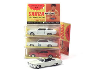 série 'SABRA' - comprend : PLYMOUTH BARRACUDA, CHRYSLER IMPERIAL cabriolet, DODGE CHARGER 'UN' (un petit manque sur un décalque) & FORD MUSTANG - manque carton d'identification sur une boîte & une autre en état 'c'