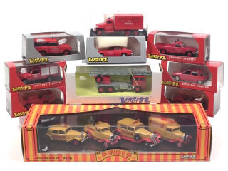 comprend 9 véhicules de pompiers - miniatures reproduisant les modèles : GMC, RENAULT (4 exemplaires différents), PEUGEOT (2 exemplaires différents) ,RANGE ROVER, CITROEN (4 exemplaires différents) & AUTO-UNION - 4 modèles 'PINDER' regroupés dans un coffret