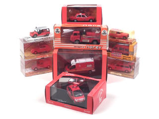 miniatures reproduisant les modèles : RENAULT (2 exemplaires différents), CITROEN (5 exemplaires différents dont un réalisé par BFM), PEUGEOT, SAVIEM (en état 'R' avec manques) & MERCEDES