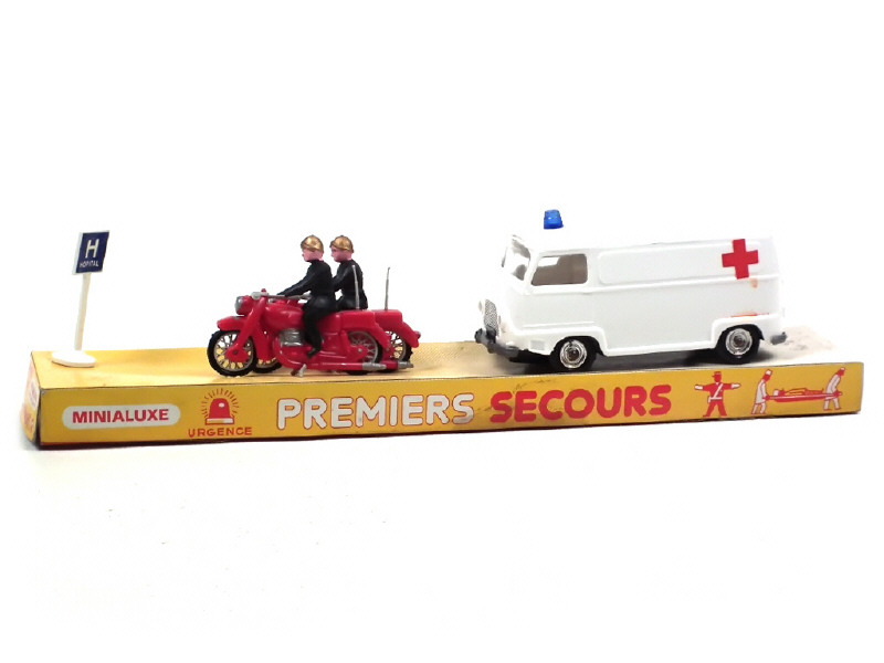 comprend : RENAULT ESTAFETTE ambulance, 2 motards & un panneau de signalisation routière - quelques petites taches sur la carrosserie - embouts d'axes de roues légèrement oxydés - un motard désolidarisé du socle de boîte