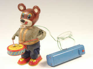 référence 33B du livre de BRIAN MORAN 'BATTERY TOYS' - hauteur 19 cm - en action le personnage avance en jouant du tambour tandis que ses yeux s'allument - mécanismes fonctionnent poussivement - fil électrique entre le personnage & le boîtier de commande à remplacer - in action, the character plays his drum & his eyes light up - mechanism works wheezily - electric wire between charcter & command box to be replaced