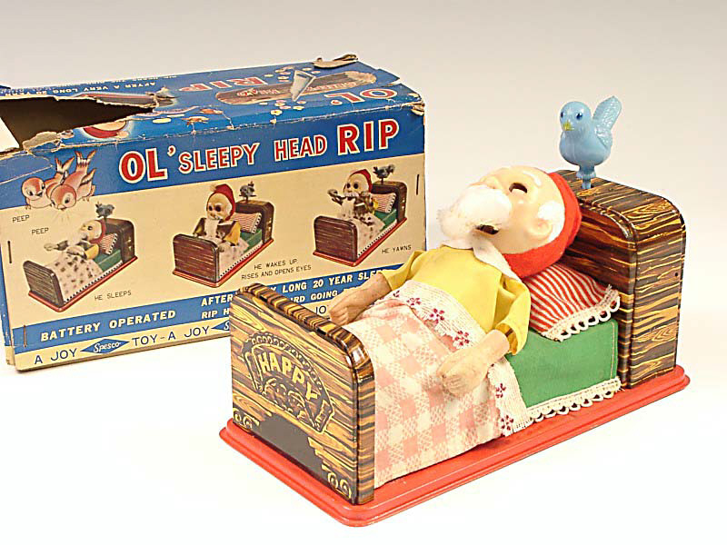 référence 47D du livre de BRIAN MORAN 'BATTERY TOYS' - longueur 23 cm - en action le grand-père dort puis se réveille, lève les bras, bâille, ouvre les yeux & son visage s'allume - l'oiseau de la tête de lit tourne sur lui-même - mécanismes fonctionnent - bruiteur de l'oiseau à revoir - in action, the sleeping Grandad wakes up, lifts his arms, yawns, opens his eyes & his face lights up - the bird at the head of the bed turns in a circle - in working condition - bird sound effects subject to verification