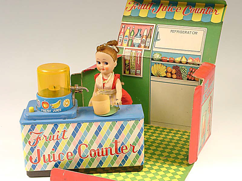 longueur 20 cm - en action la serveuse tourne sur son tabouret vers le distributeur pour remplir son verre puis se retourne vers le client tandis que la machine continue à agiter le jus de fruit - mécanismes fonctionnent - avec boîte diorama - in action, the waitress turns towards the drinks machine to fill up her glass, then turns back towards the customer as the machine continues to shake the drink - in working condition - with diorama box
