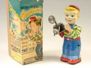 référence 49F du livre de BRIAN MORAN 'BATTERY TOYS' - hauteur 21 cm - en action le personnage avance, lève son appareil pour prendre des photos tandis que le flash s'allume - mécanismes à revoir - in action, the charatcer moves forward, lifts his camera & his flash lights up - mechanism subject to verification