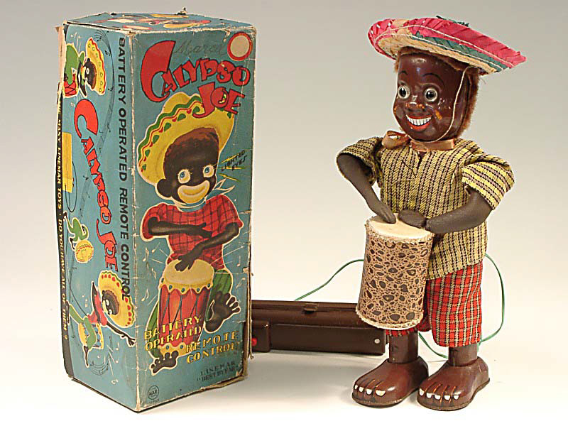référence 39A du livre de BRIAN MORAN 'BATTERY TOYS' - hauteur 27 cm - en action le personnage avance tout en jouant du tam-tam tandis que ses yeux s'éclairent & que sa tête bouge - mécanismes fonctionnent - le caoutchouc des bras a sèché avec le temps - fil électrique entre le personnage & le boîtier de commande à changer - in action, the character moves forward whilst playing the tam-tam, his eyes light up and he moves his head - in working condition - arm rubber dried out with time - wire between character & command box needs changing