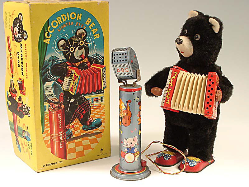hauteur 27 cm - en action l'ours joue de l'accordéon devant un micro sur pied tandis que ses yeux s'éclairent & qu'il bouge son corps & sa tête - mécanismes à revoir - oxydation du compartiment des piles - in action, the bear plays the accordian in front of a stand-up mike as his eyes light up & he moves his body & head - mechanism subject to verification - rust in the battery compartment