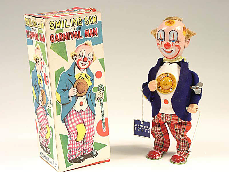 hauteur 25 cm - mécanisme à ressort (fonctionne) - en action le personnage fait tourner sa canne, secoue la tête & se déplace en faisant varier sa hauteur - avec étiquette du magasin 'AU NAIN BLEU, PARIS' - in action, the charatcer swings his cane, shakes his head & moves around, changing height - with 'AU NAIN BLEU, PARIS' sticker