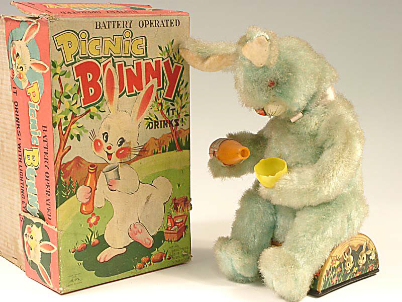 hauteur 25 cm - en action le lapin se verse un jus de carotte dans un verre & le boit tandis que ses yeux s'éclairent - mécanismes à revoir - oxydation à l'arrière du socle - in action, the rabbit pours herself a carrot juice into a glass, her eyes light up as she drinks it - mechanism subject to verification - rust on back of base