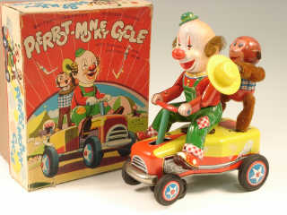 longueur 20 cm - en action le véhicule avance en zigzaguant & en contournant les obstacles tandis que les personnages bougent d'avant en arrière & que le nez du clown s'allume - avec sonnerie - mécanismes fonctionnent - in action, the vehicle zigzags forward, going around any obstacles - both charcters move about and the clown's nose lights up - in working condition