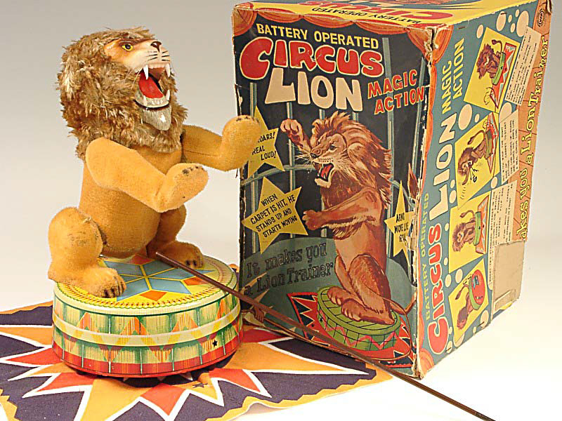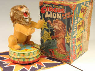 référence 5C du livre de BRIAN MORAN 'BATTERY TOYS' - hauteur 27 cm - en action le lion se dresse, rugit, agite ses pattes avant & sa tête lorsque l'on frappe de la baguette un des côté du tapis & se rasseoit lorsque l'on frappe de la baguette sur l'autre côté du tapis - mécanismes fonctionnent - le mécanisme permettant au lion de se rasseoir fonctionne de manière aléatoire - avec tapis & baguette - in action, the lion stands up, roars, waves his front paws & his head when you hit one side of the carpet with the baton, sits back down when you hit the other side of the carpet - in working condition - the mechanism which allows the lion to sit down functions randomly - with carpet and baton