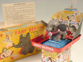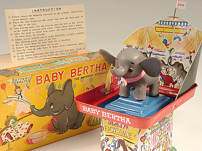 référence 7C du livre de BRIAN MORAN 'BATTERY TOYS' - hauteur 30 cm - en action l'éléphant se dresse sur ses pattes arrière & projette de l'eau par sa trompe - mécanismes à revoir - avec notice - in action, the elephant rears up on his back feet & squirts water through his trunk - mechanism subject to verification - with leaflet