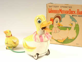 référence 4E du livre de BRIAN MORAN 'BATTERY TOYS' - hauteur 17 cm - en action la cane avance ,tourne la tête vers le caneton qu'elle tire & cancane - mécanismes fonctionnent - fond de boîte non d'origine - in action, the duck moves forwards, turns her head towards the duckling that she is pulling & quacks - in working condition - bottom of the box not original