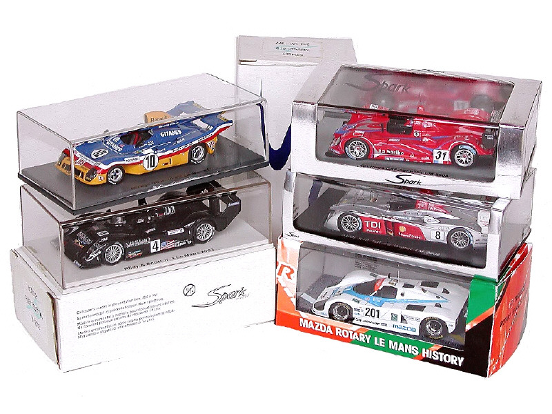 miniatures reproduisant les modèles : MIRAGE M9 1977, MAZDA 767 1988, RILEY & SCOTT 2003, COURAGE C65 2004 & AUDI R10 TDi 2006