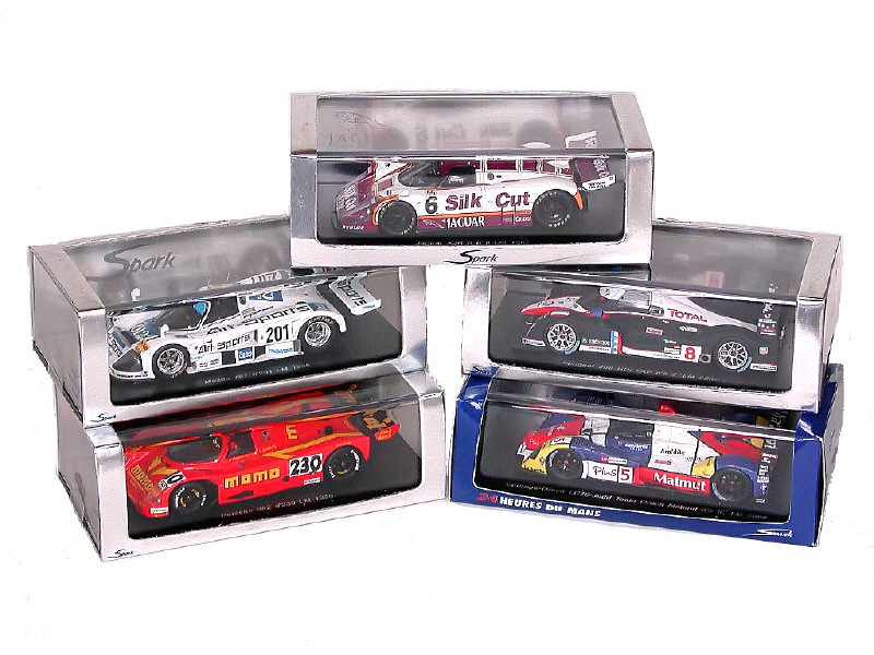 miniatures reproduisant les modèles : JAGUAR XJR8 1987, PORSCHE 962 1990, MAZDA 787 1990, PEUGEOT 908HDi 2007 & COURAGE LC70 2008