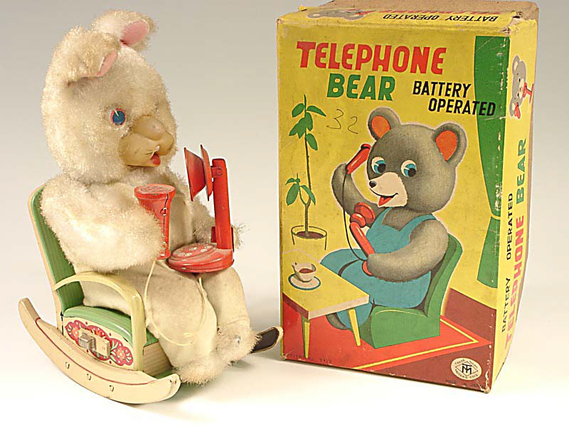 référence 16A du livre de BRIAN MORAN 'BATTERY TOYS' - hauteur 26 cm - en action l'animal se balance sur son rocking-chair - lorsque le téléphone sonne il approche l'écouteur de son oreille & se met à parler dans le micro - mécanismes fonctionnent - in action, the animal rocks in its rocking chair - when the 'phone rings he lifts the receiver to his ear and speaks into the mouthpiece - in working condition