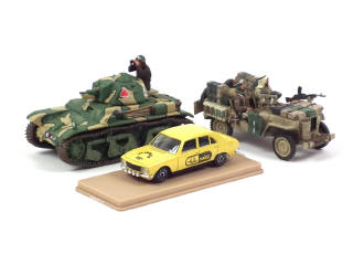 échelle 1/32ème - comprend : RENAULT R35 char de l'armée française (une extrémité de garde-boue recollée) & JEEP 'SAS' - on y joint une PEUGEOT 504 'HELLER SOLIDO' de la marque SOLIDO