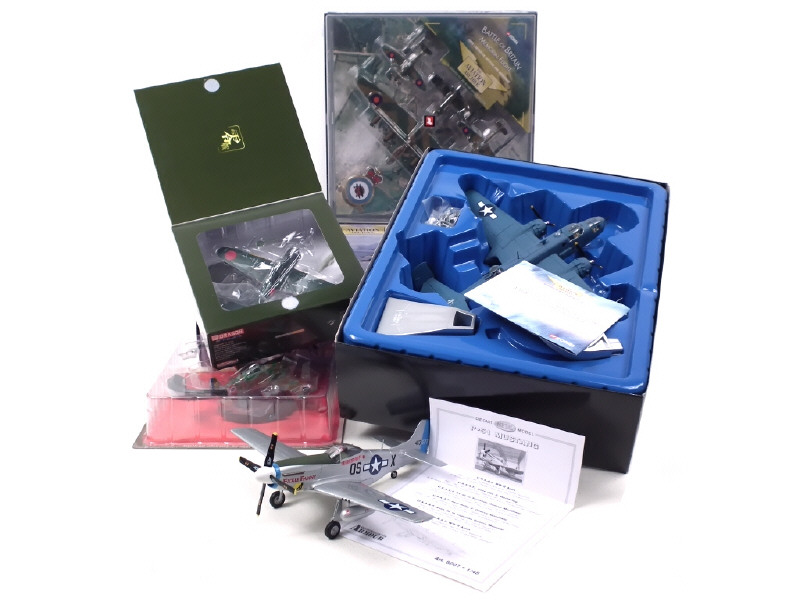 différentes échelles - miniatures reproduisant les modèles : P.51 MUSTANG, A6 M2 ZERO, MORANE-SAULNIER MS.406, AVRO LANCASTER, SPIDEFIRER, HURRICANE & B-25 PBJ-1D - on y retrouve notamment les marques : CORGI TOYS (3 modèles regroupés dans un coffret & un autre avec certificat), ARMOUR & DRAGON