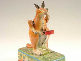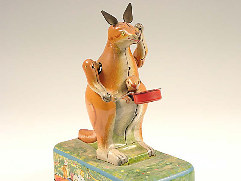 référence 17C du livre de BRIAN MORAN 'BATTERY TOYS' - hauteur 21 cm - en action le kangourou fait des bulles tandis que son petit tourne la tête - mécanismes fonctionnent - soufflerie à revoir - in action, the kangeroo blows bubbles as the little one turns his head - in working condition - blowing mechanism subject to verification
