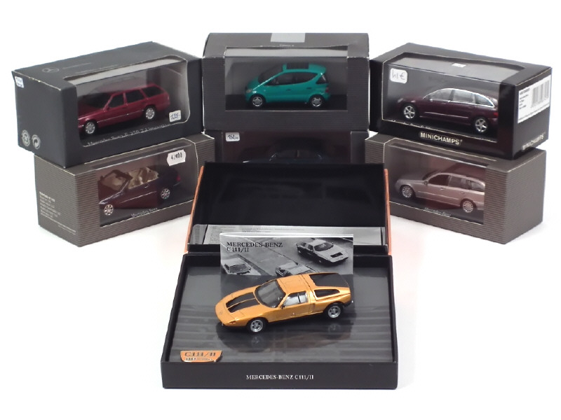 comprend : C111/II, CLASS R, CLK cabriolet, CLASS E break, CLASS A (un rétroviseur à refixer), 320 E break limousine & 320 E ELEGANCE (boîte en état 'c') - on y retrouve les marques : MINICHAMPS & HERPA