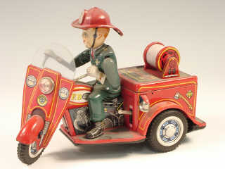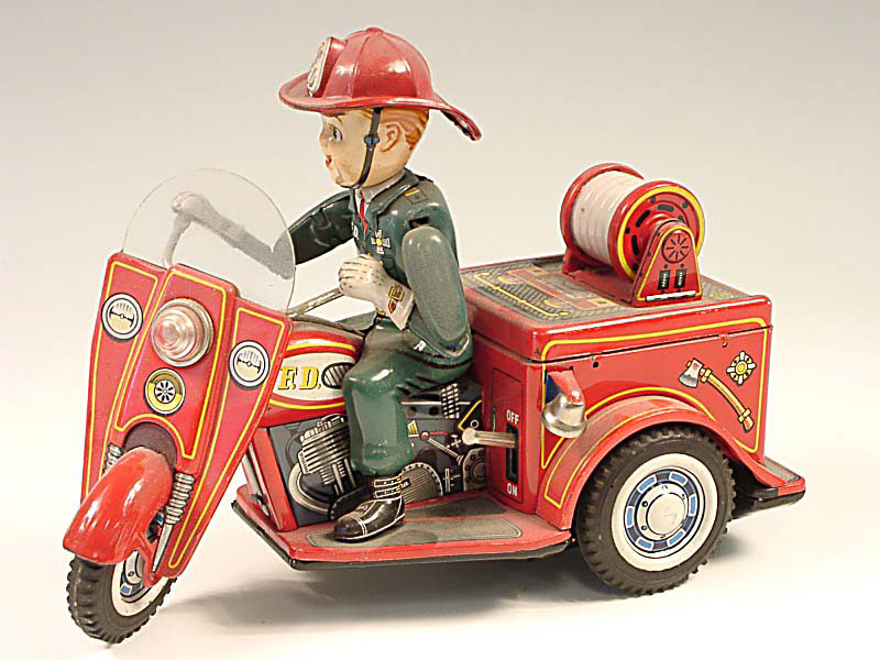 longueur 25 cm - en action la moto avance tandis que le phare s'allume - avec bruiteur - mécanismes fonctionnent - compartiment des piles légèrement oxydé - mécanisme du guidon à revoir - in action, the motorbike moves forward & the warning light lights up - with sound effects - in working condition - battery compartment slightly rusted - steering mechanism subject to verification