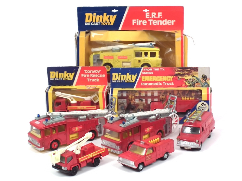 DINKY TOYS (GB) Ensemble de 5 camions & 3 camionnettes de pompiers rouge & jaune
