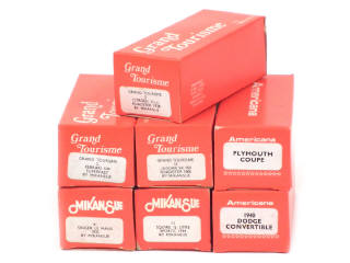 miniatures reproduisant les modèles : CITROEN 11CV, DODGE, FERRARI 500, JAGUAR XK 150, PLYMOUTH, SQUIRE & SIGNER LE MANS - on y retrouve les marques : AMERICANA & MIKANSUE - semblent complet - avec notices