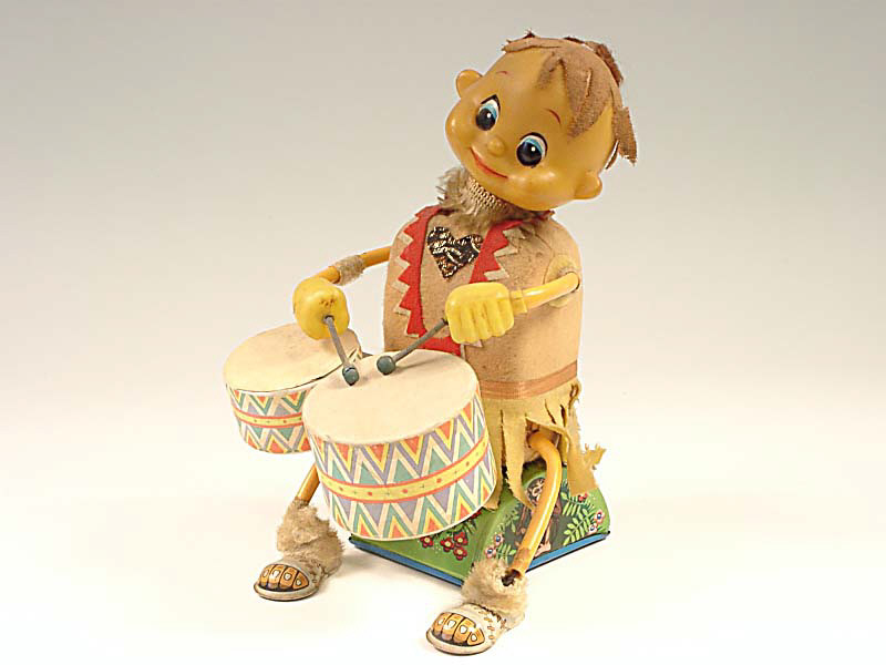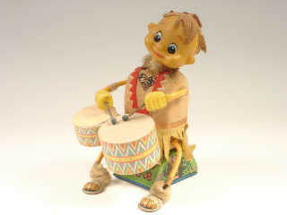 référence 50F du livre de BRIAN MORAN 'BATTERY TOYS' - hauteur 25 cm - en action le personnage joue du tambour tandis que son corps & sa tête remuent de gauche à droite - mécanismes fonctionnent - un tambour restauré - in action, the character plays the drum as his head & body wriggle from side-to-side - in working condition - one drum is restored