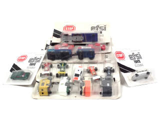 petites échelles - miniatures reproduisant les modèles : BMW, FORD, CITROEN, FERRARI, BRABHAM, Mc LAREN, LOTUS, PORSCHE (2 exemplaires différents), COMMER (2 exemplaires différents), MERCEDES (4 exemplaires différents) - 13 véhicules regroupés dans 4 blisters dont 3 jamais ouverts (un blister en état 'c')
