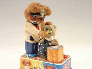 référence 9C du livre de BRIAN MORAN 'BATTERY TOYS' - hauteur 23 cm - en action le dentiste passe la roulette sur sa patiente qui se débat - la roulette s'allume - avec bruiteur - mécanismes fonctionnent sauf celui de la tête du dentiste - in action, the dentist is drilling the patient who is struggling - the drill lights up - with sound effects - in working condition other than the mechanism in the dentist's head