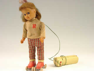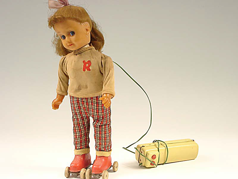 hauteur 31 cm - en action la fillette fait du patin à roulettes - mécanismes à revoir - fil électrique entre le personnage & le boîtier de commande à changer - manque attache de fermeture du compartiment à piles - in action, the girl roller-skates - mechanism subject to verification - electirc wire between character & command box needs changing - missing battery compartment hook