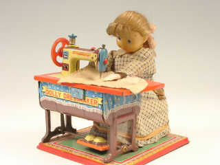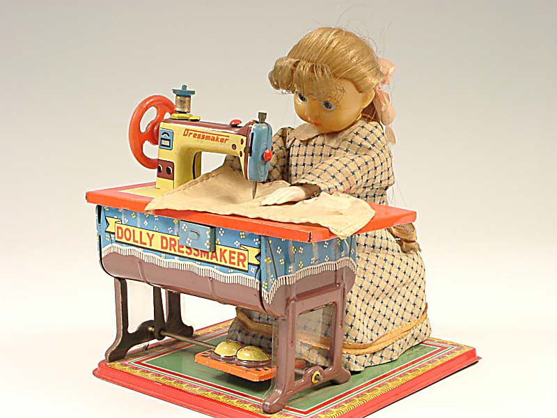 référence 46B du livre de BRIAN MORAN 'BATTERY TOYS' - hauteur 18 cm - en action le personnage travaille sur sa machine à coudre - la tête, les pieds & les mains bougent tandis que le plateau de la machine à coudre s'éclaire en présentant différents motifs sous le tissu - avec bruiteur - mécanismes fonctionnent - in action, the charcter works on her sewing machine - the head, feet & hands move as the table-top of the sewing machine lights up underneath the material highlighting different patterns - with sound effects - in working condition