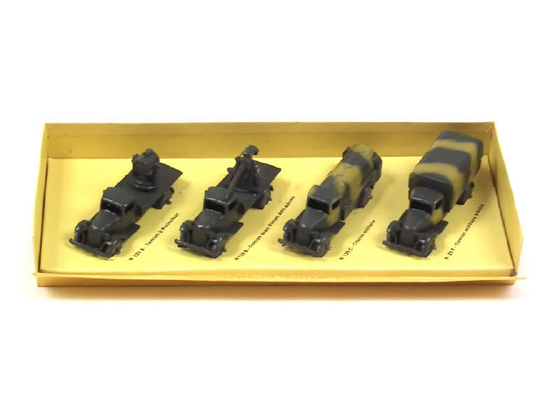 création sur base DINKY TOYS (modèles transformés & repeints) - contient : camion-plateau avec projecteur antiaérien, camion-plateau avec canon antiaérien, camion-citerne & camion-plateau bâché - avec boîte copie & sa cale de présentation - ce coffret aurait du être produit par DINKY TOYS FRANCE en 1940 mais n'a malheureusement pas vu le jour - BELLE REALISATION !