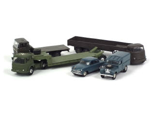 états de 'A' à 'C' - comprend : DAF semi-remorque plateau (un éclat majeur sur le toit de cabine), plateau, BEDFORD semi-remorque surbaissée (manque un rétroviseur, peinture ternie), LAND ROVER 109 WB RAF bâché & STANDARD VANGUARD III RAF - on y retrouve les marques : CORGI TOYS & LION CAR