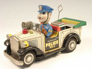 longueur 24 cm - en action le véhicule avance en contournant les obstacles - le conducteur actionne la manivelle de la sirène tandis que le gyrophare rouge de capot clignote - avec bruiteur - mécanismes fonctionnent - in action, the vehicle moves forward, going around any objects in its way - the driver activates the siren crank when the red light flashes - with sound effects - in working condition
