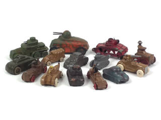 états de 'C' à 'R' - comprend : 6 chars, 6 automitrailleuses, un camion & un tracteur - on y retrouve notamment les marques : ARCADE, CHARBENS & RALSTOY - avec manques, parties cassées & quelques roues séchés - on y joint un rare modèle en plâtre & farine de couleur camouflé