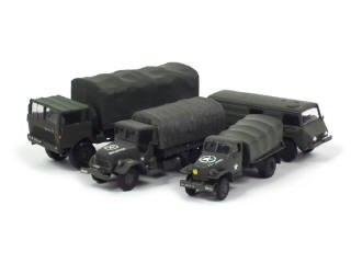 comprend notamment : BERLIET plateau à ridelles bâché, GMC plateau à ridelles bâché & PINZGAUER - on y retrouve notamment la marque ESDO - quelques petits accessoires manquants