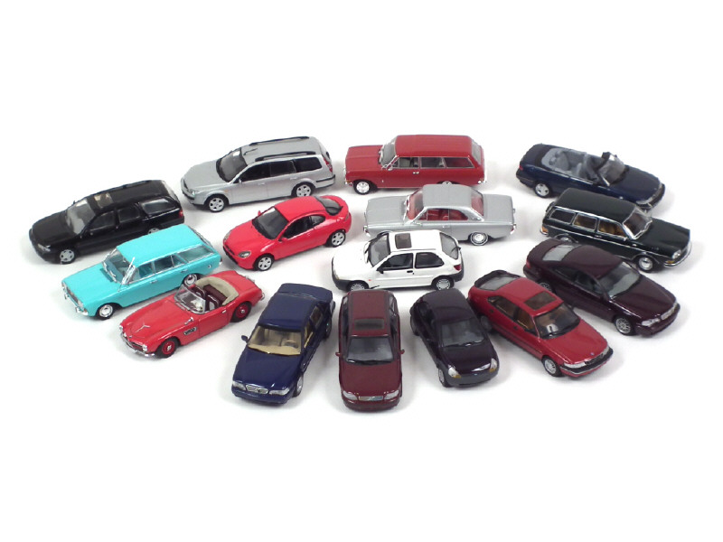 miniatures reproduisant les modèles : BMW, FORD (7 exemplaires différents), OPEL, SAAB (2 exemplaires différents), VOLKSWAGEN & VOLVO (3 exemplaires différents) - quelques petits manques & pièces à recoller