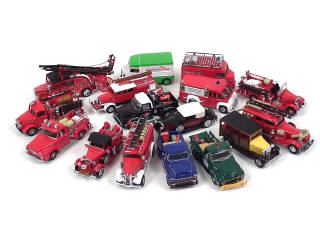 miniatures reproduisant les modèles : ALBION, BEDFORD, CADILLAC, CHEVROLET, CITROEN (2 exemplaires), DODGE, FORD (7 exemplaires), GMC, LAND ROVER, LEYLAND, MACK (2 exemplaires), MERCEDES, MORRIS, PACKARD, ROLLS ROYCE & WALKER - on y joint un PETERBILT de la collection 'SUPER KINGS'