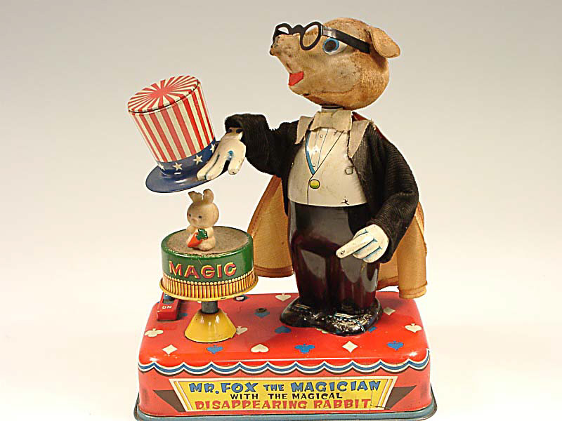 référence 20C du livre de BRIAN MORAN 'BATTERY TOYS' - hauteur 23 cm - en action le renard fait apparaître puis disparaître un lapin avec son chapeau magique - mécanismes fonctionnent - manque l'aimant du lapin (permettant son escamotage) & la truffe du renard - in action, the fox makes a rabbit appear, then disappear with his magic hat - in working condition - missing rabbit's magnet (which allows it to vanish) & the fox's nose